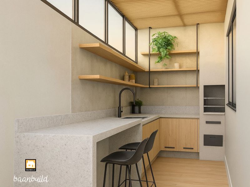 ลองจินตนาการเตาแก๊สวางในมุมอากาศไหลผ่านดี ๆ มีหลังคาโปร่งแสงช่วยให้แสงธรรมชาติส่องเข้ามา และผนังเปิดบางส่วนให้ลมเดินสะดวก… แค่นี้ความรู้สึกตอนเข้าครัวก็เปลี่ยนไปอย่างไม่น่าเชื่อแล้วค่ะ