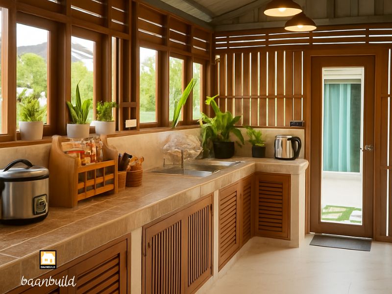 ถ้าบ้านไหนทำอาหารไทยบ่อย ๆ เช่น ผัดเผ็ด ไข่เจียวฟู ๆ แกงกะทิสายโหด… ครัวปูน ครัวไทย คือคำตอบที่ตรงที่สุดค่ะโครงสร้างปูนทำให้ ทนร้อน ทนชื้น ทนน้ำมัน ทำความสะอาดง่าย จะเลอะยังไงก็ไม่กลัวพัง